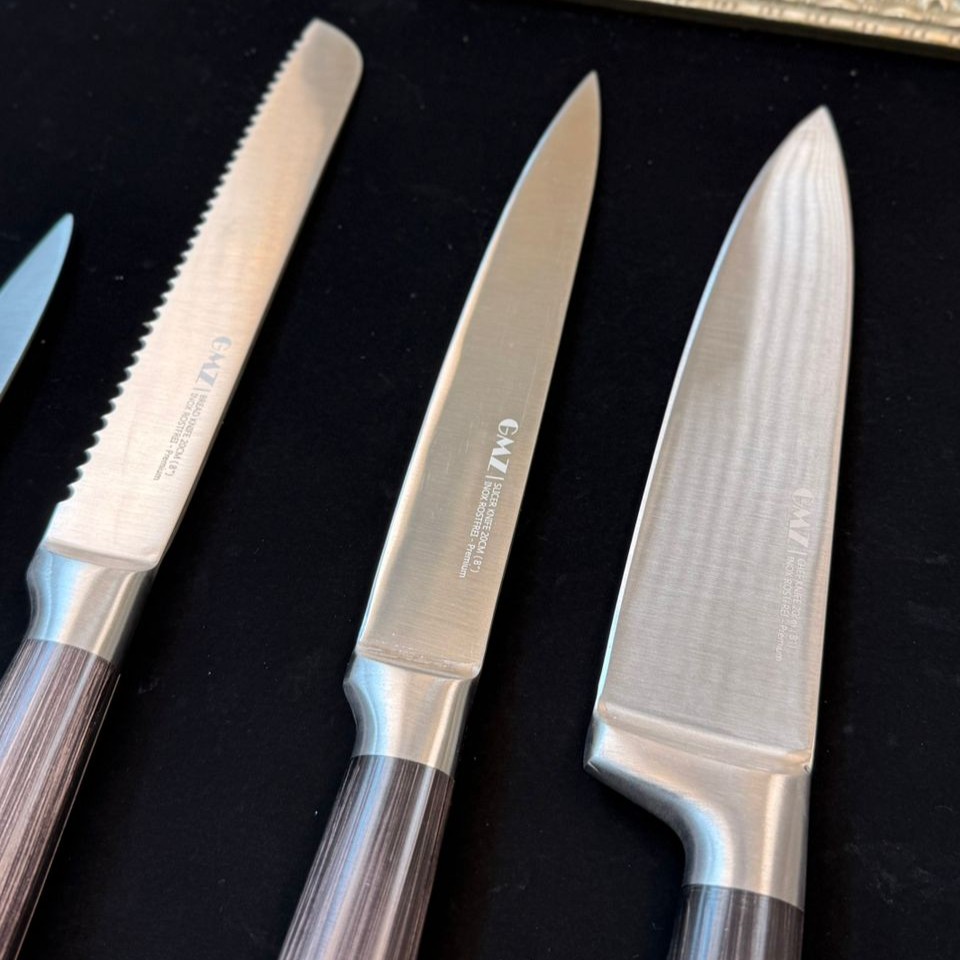 استند چاقو ۶پارچه برند GMZ جنس استیل با کیفیت و ضخیم در عین حال بسیار سبک و خوش دست دارای ضمانت اصالت کالا برند حک شده روی کار |